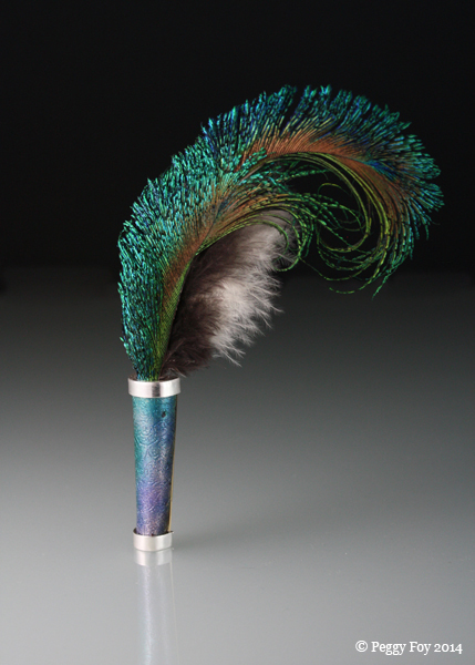 2011 - Hat Pin #5; enamel on etched copper, sterling, brass, steel, magnet, feathers.