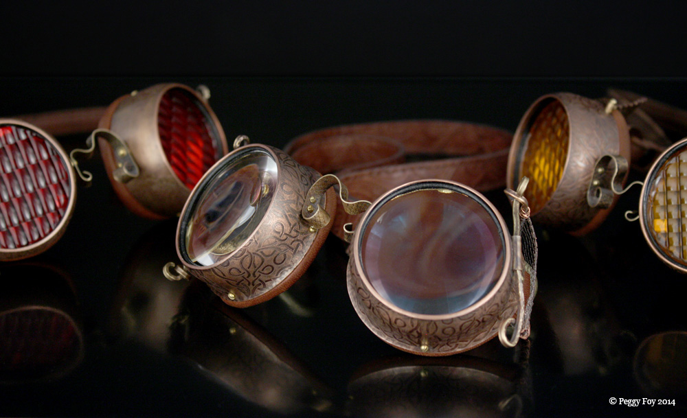 2011 - Steampunk Goggles; Copper, brass, vintage lenses & reflectors, recycled leather.