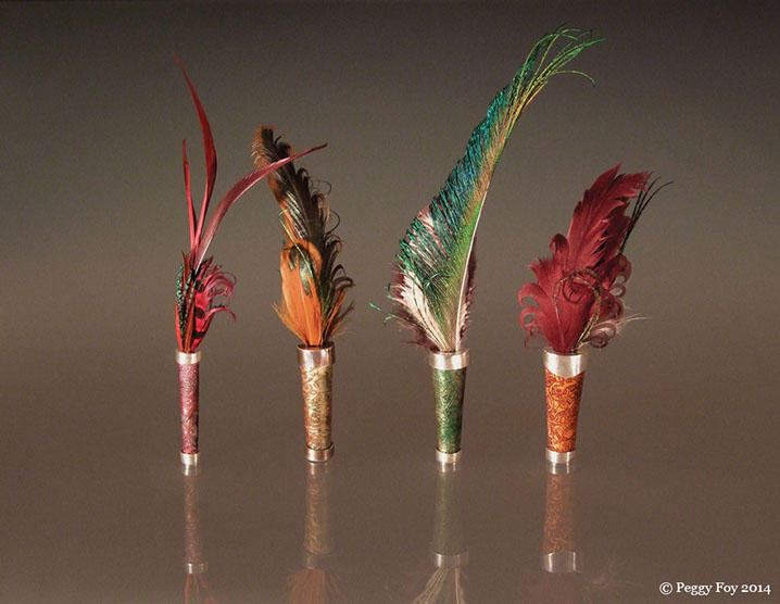 2010 - Enamel Hat Pins; enamel on etched copper, sterling, brass, steel, magnet, feathers.