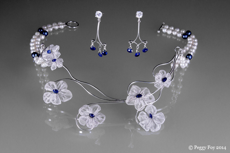 2013 - Martha's Wedding Set; sterling, fine silver, kyanite, pearls. Earrings: sterling, kyanite, cubic zirconia. Couture wedding set.