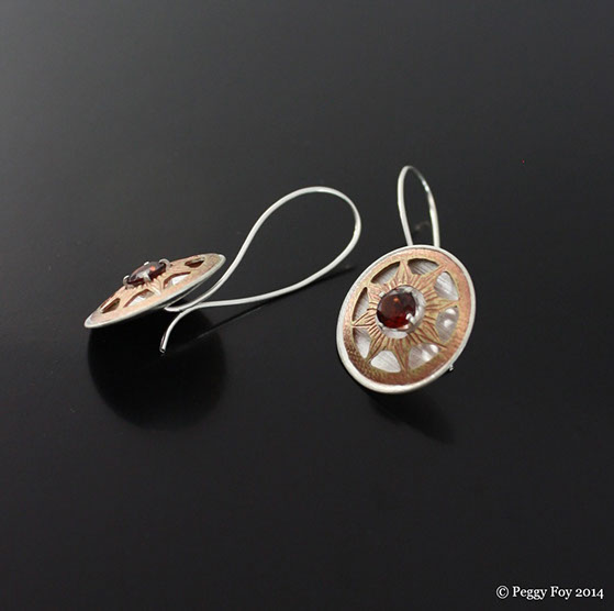 2010 - Spinner Earrings; Sterling, brass, garnet. Available by special order.