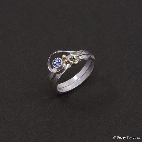 2013 - Stacking Rings; Sterling, 14k, Tanzanite, Green Sapphire. Currently available on Etsy.